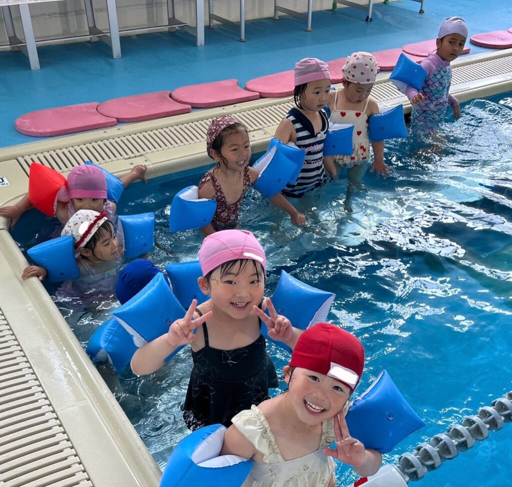 夏季は、園庭にプールを設置。年中・年長は年間を通じてスクールバスでスイミングのプールに通い、段階に応じたコーチの指導を受けます。